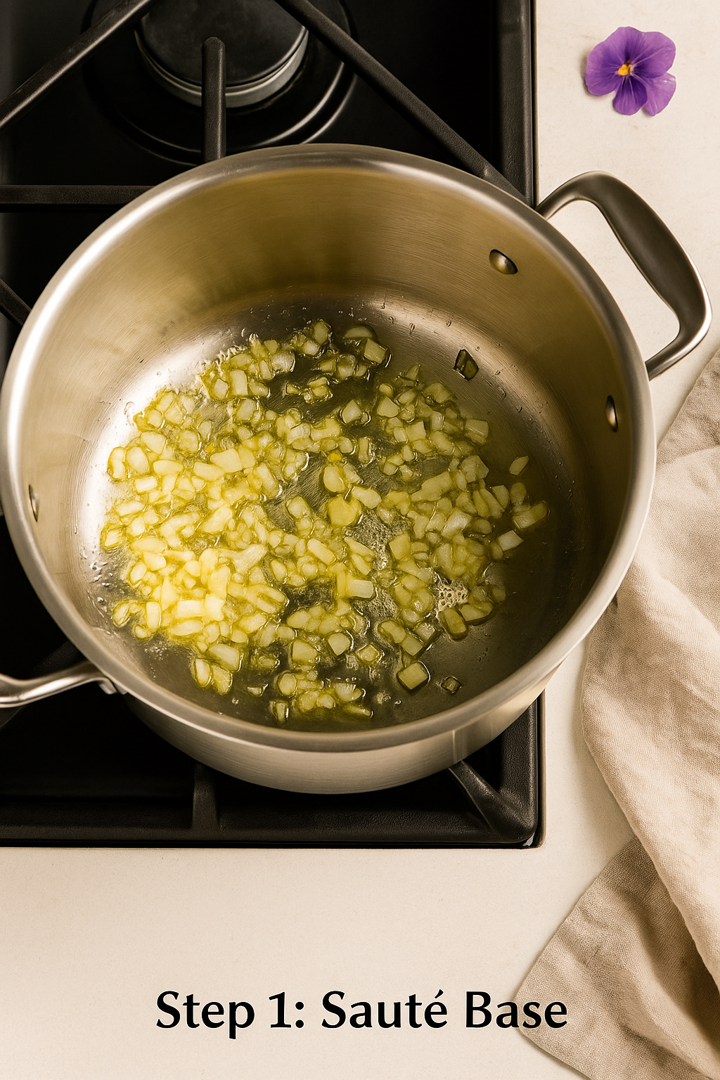 Heat olive oil or butter in a large pot. First, sauté onion and garlic until fragrant.