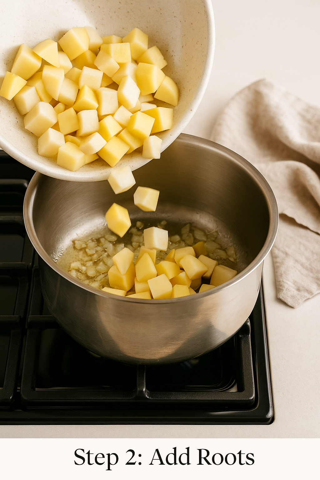 - Add chopped parsnips, celery root, and potato. Stir to coat in aromatics.