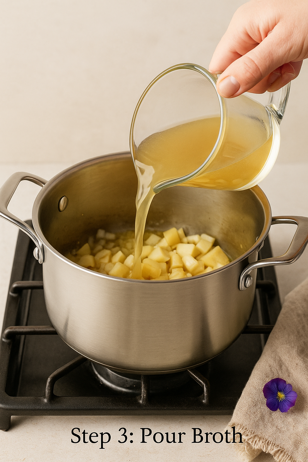 - Then, pour in broth, bring to a boil, and reduce to a gentle simmer.